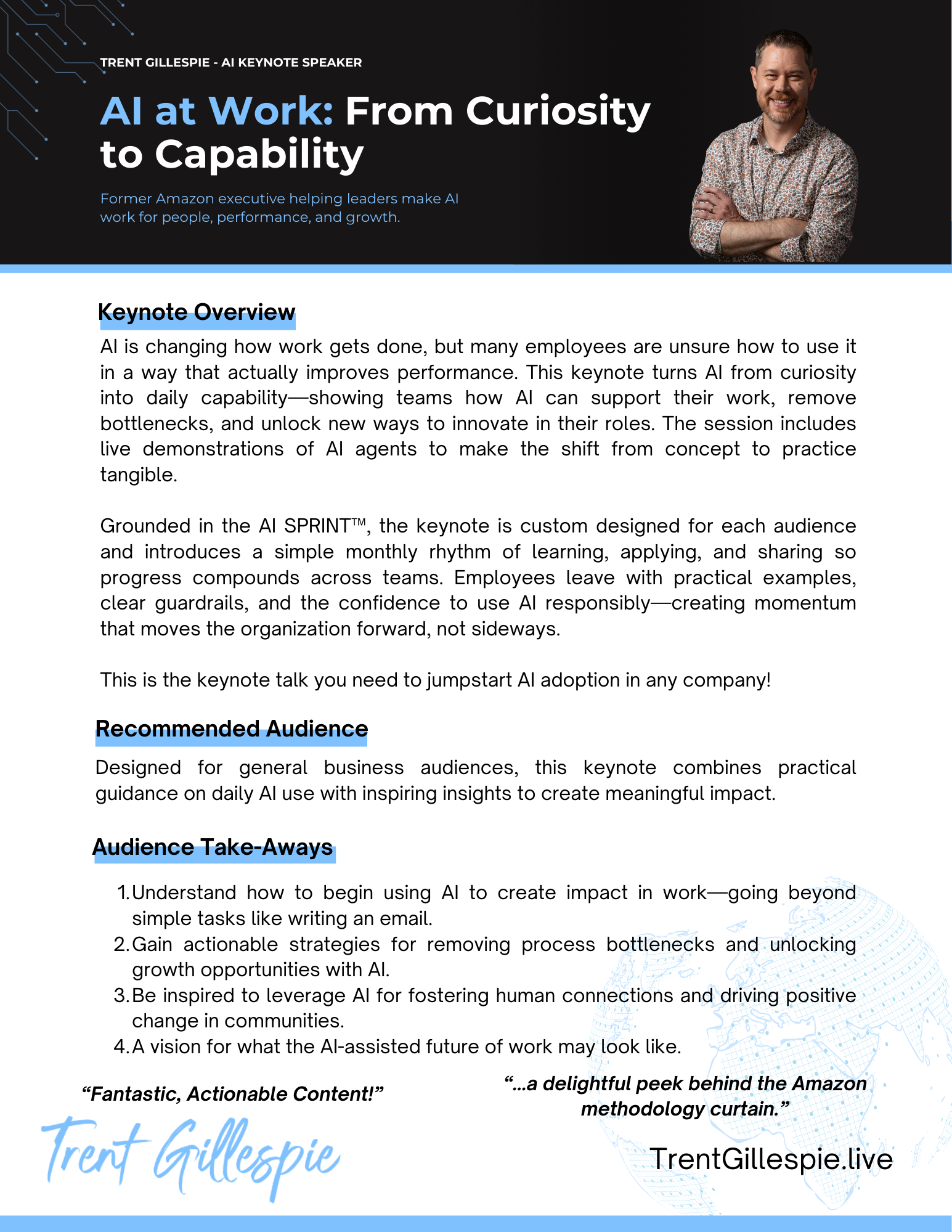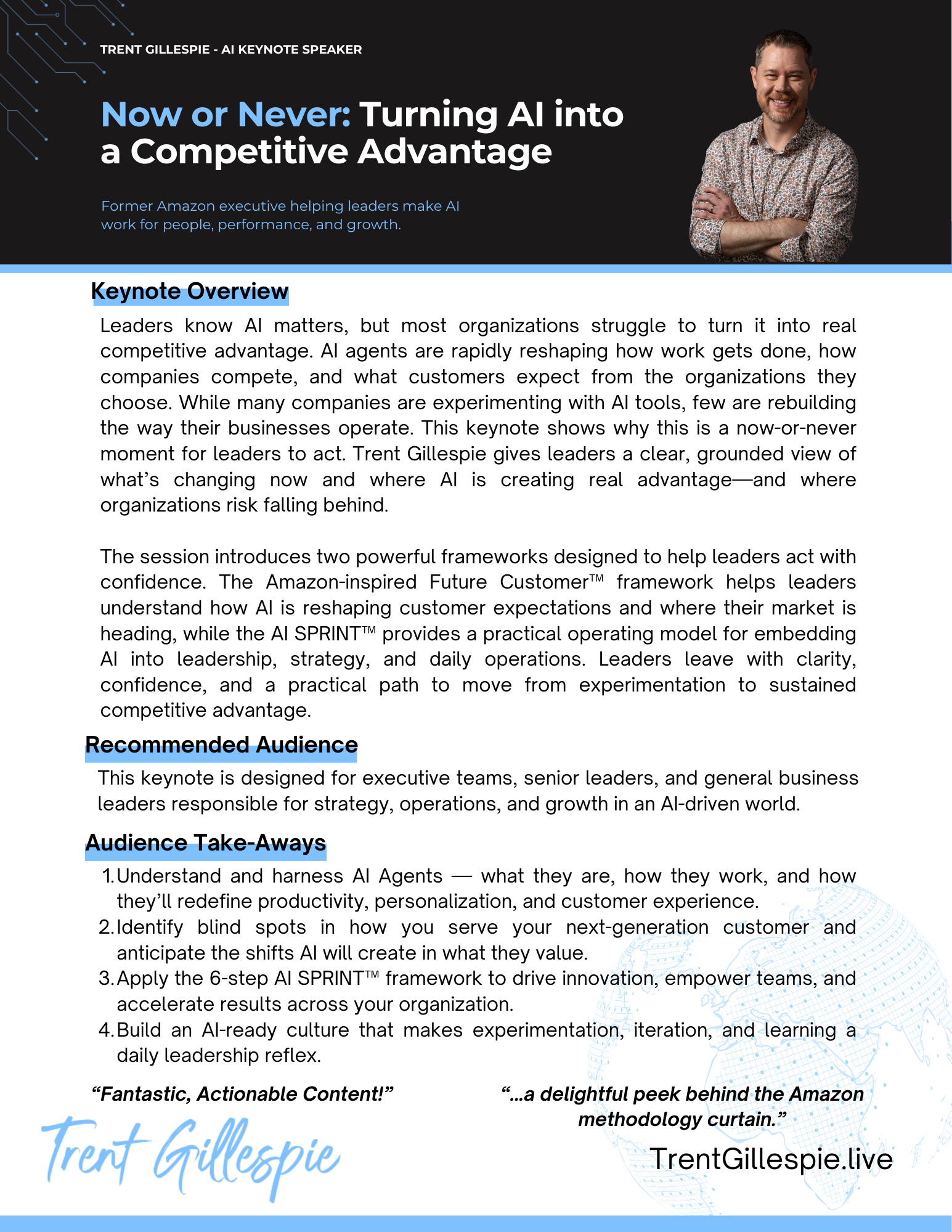 Leaders know AI matters, but most struggle to turn it into real advantage inside their organizations. AI agents are rapidly reshaping how work gets done, how companies compete, and what customers expect. In this keynote, Trent shows leaders how to move beyond experimentation and make AI work where business actually runs. Using his Amazon-inspired Future Customer™ framework and the AI SPRINT™, Trent outlines how to align leadership, rethink strategy, and embed AI into daily operations. The result is clarity, a practical roadmap, and the confidence to turn the AI moment into sustained competitive advantage.