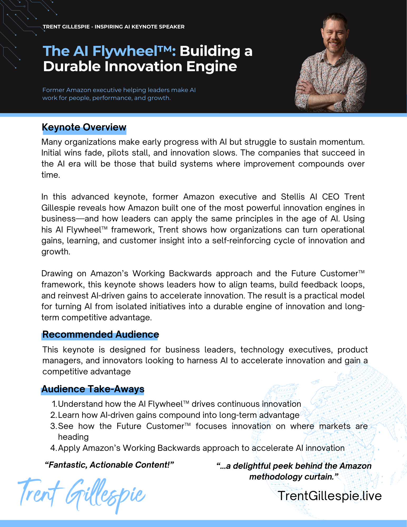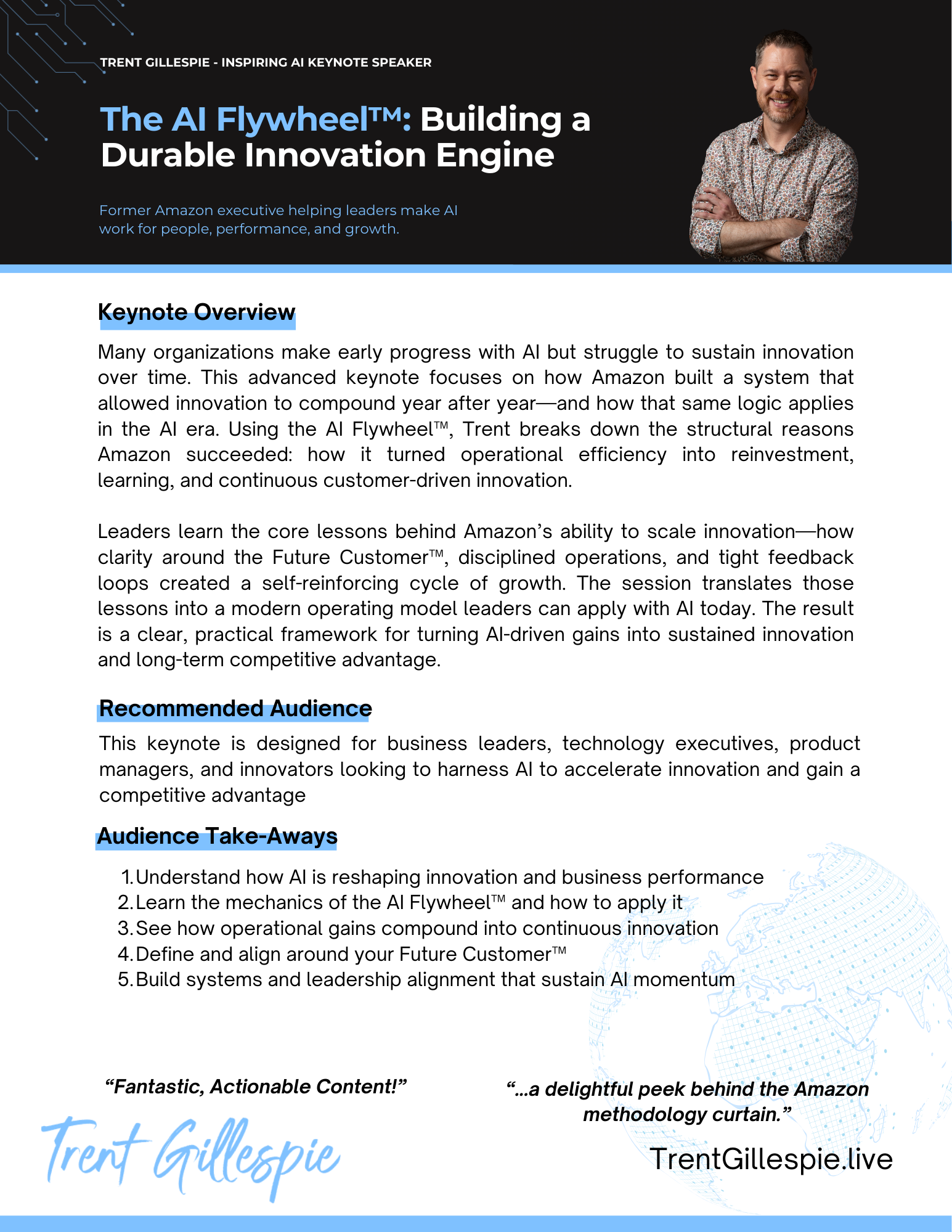 Early AI wins are easy. Sustaining momentum is harder. In this advanced keynote, Trent shows how organizations turn AI-driven gains into a self-reinforcing cycle of innovation using the AI Flywheel™. Leaders learn how to align teams, reinvest efficiency into growth, and build a durable innovation engine—so AI becomes a lasting operating advantage, not a one-time initiative.